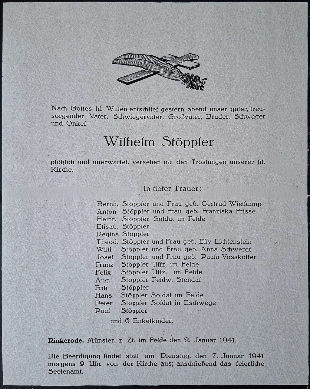 Bei der Themenfindung der Hausarbeit „War mein Opa ein Nazi?“ kam mein Opa erst mal kaum in Frage. Zum Ende des zweiten Weltkrieges war er erst vier Jahre alt. Sein Vater sollte Ende 1944 zum Volkssturm eingezogen werden. [Erfahren in Gesprächen mit meinem Opa] Nach einem Schlaganfall und heftigen Auseinandersetzungen mit dem damaligen NSDAP Ortsgruppenleiter, starb er im Februar 1945. Er hatte mit seinen drei Brüdern am ersten Weltkrieg teilgenommen. Deutlich interessanter für die Hausarbeit beziehungsweise Ahnenforschung, ist die familiäre Linie meiner Oma. Sie selbst war zum Ende des Krieges 1945 erst drei Jahre alt. ihr Vater kam aus einer außergewöhnlich großen Familie [Bild 1], mit insgesamt 15 Geschwistern. Darunter dienten neun von ihnen im Krieg, davon verloren zwei ihr Leben an der Front. Diese Konstellation verdeutlicht, wie tief Kriegserfahrung und die damalige politische Entwicklung auch im familiären Umfeld eingebettet war.
