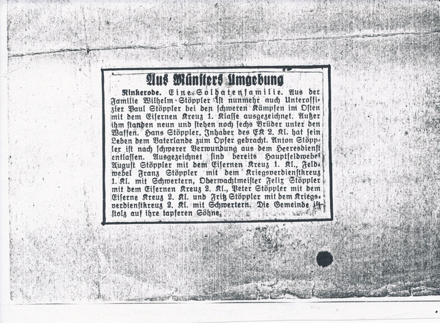 Der 2. Weltkrieg bestimmte ganz wesentlich das Leben und Sterben in der Familie Stöppler. Auf den Fotos aus dieser Zeit sind fast immer Soldaten in Uniform abgebildet. Ein Bild ist sehr interessant. Da ist der Vater Wilhelm Stöppler mit der Uniform seines Sohnes August Stöppler [Bild 11 Seite 2.1] abgebildet. Offensichtlich war er auch stolz auf seine Söhne. Er selbst hatte in den 1880er Jahren einen dreijährigen Wehrdienst geleistet und war später aktiv im Kriegerverein Rinkerode. Wilhelm Stöppler verstarb plötzlich am 01.01.1941. Auf seiner Todesanzeige sind alleine sechs Söhne verzeichnet, die zu diesem Zeitpunkt im Krieg waren.