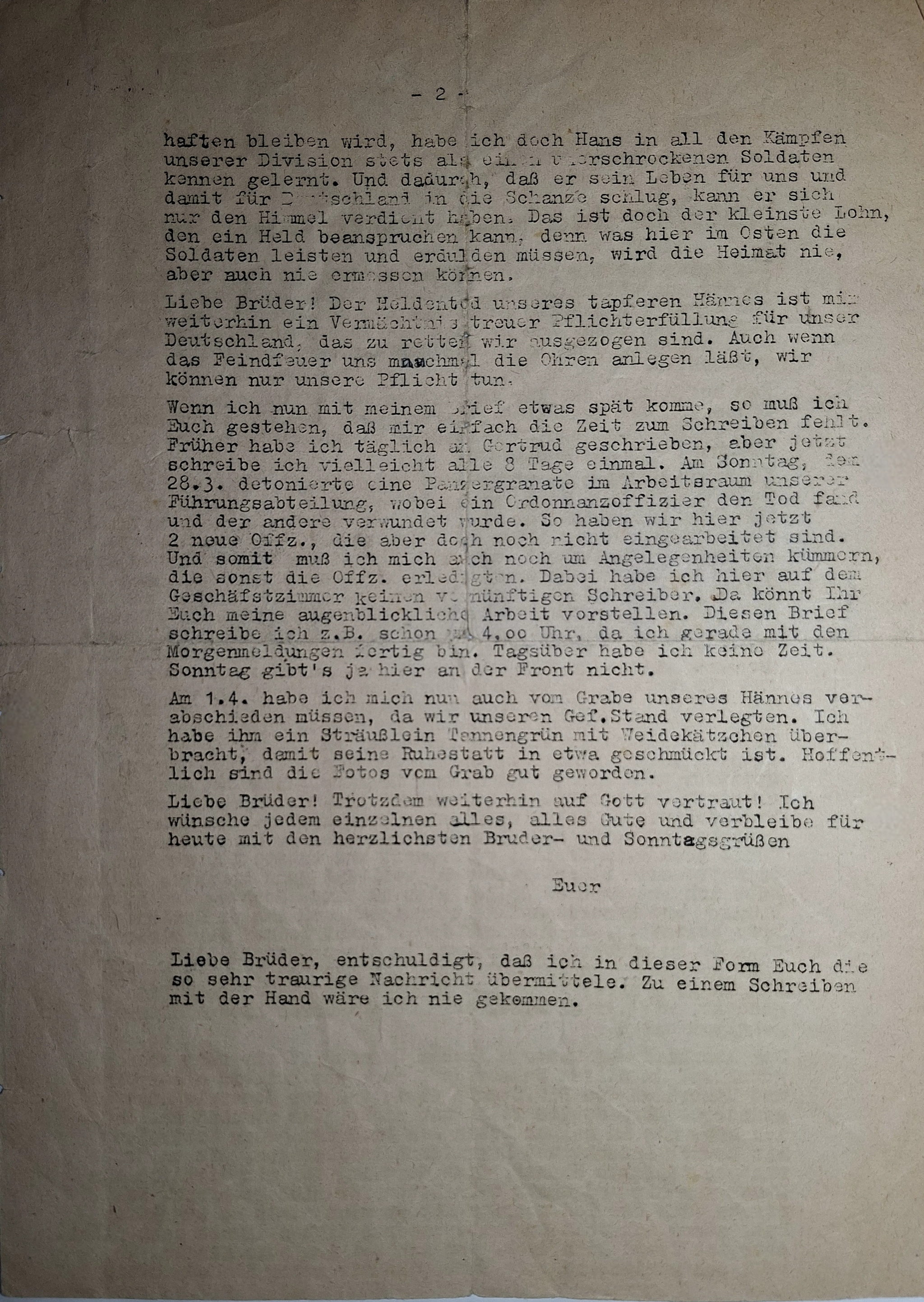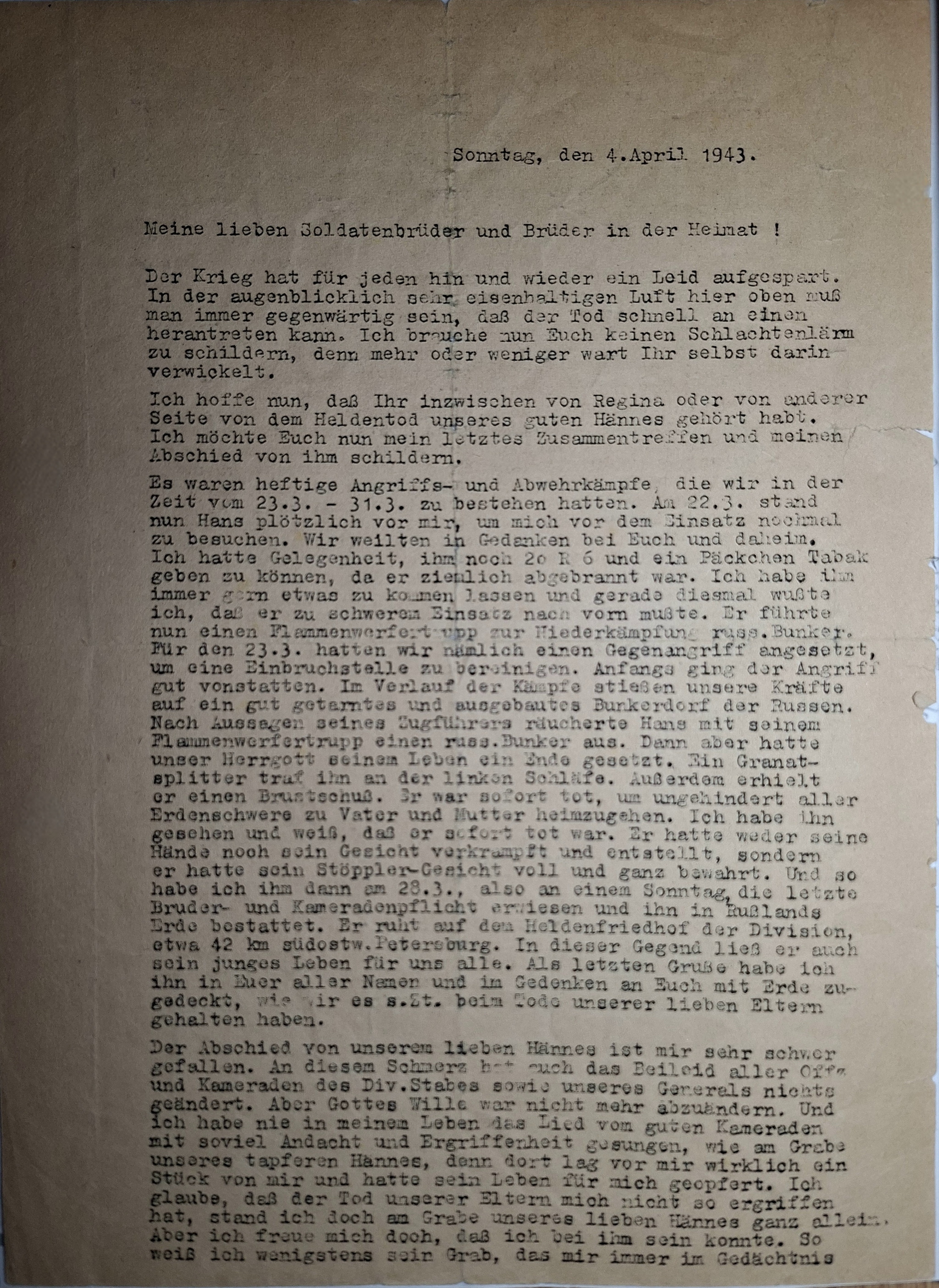 Johann (Hans) Stöppler verstarb am 23.03.1944 südöstlich von St. Petersburg. Das Totenbild, das in der Regel während des Trauerseelenamtes in der Kirche verteilt wurde, beinhaltet großes Gottvertrauen und spricht von einem „Heldentod“, eine damals gängige Bezeichnung, wenn ein Soldat im Krieg gefallen war. Ein besonders bewegendes Dokument ist der Brief [Bild 13a/b] seines Bruders Franz, der sehr ausführlich über die Todesumstände und die Beerdigung in Russland berichtete.