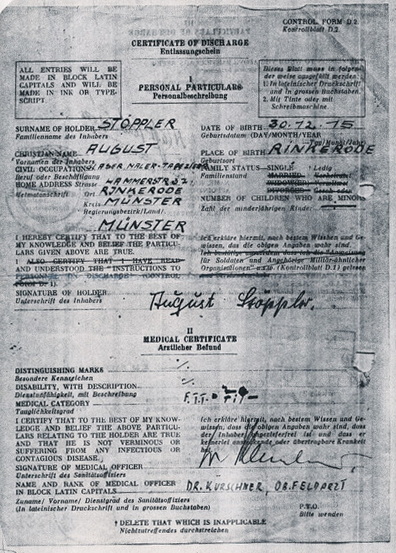 Nach dem Ende des Krieges am 02.05.1945 hielt August Stöppler sich noch in Italien auf. Nachdem die Schlacht um Monte Cassino verloren war, zogen die Fallschirmjäger sich immer mehr aus Italien zurück und konnten ihre Stellungen nicht mehr halten. Schließlich wurde August Stöppler am 02.05.1945 in Levico 20 Kilometer östlich von der Stadt Trient in Südtirol, Norditalien gefangengenommen. [Bild 8 Seite 2] Der Camp Name beziehungsweise die Region, in der er bis zum 05.05.1946 blieb, ist hierbei schwer zu erkennen. Vermutlich handelt es sich um einen medizinischen Teil des Lagers, da August Stöppler auf seinem Entnazifizierungsbericht ein Kreuzschnitt [Bild 16a/b] am Unterschenkel aufweist. Dafür spricht auch, dass sein Entlassungsschein vom Oberfeldarzt Dr. Dietrich Kürschner unterschrieben wurde, der laut dem Bundesarchiv als Fliegerarzt galt. Am 20.04.1946 wurde August Stöppler aus der Kriegsgefangenschaft schließlich entlassen und kehrte zu seinem Elternhaus in Rinkerode Hemmer 37 zurück. Anschließend fing er bereits am 21.04.1946 bei seinem Bruder Paul Stöppler in Rinkerode als Malergehilfe an und lebte in der Zeit weiterhin in Rinkerode in seinem Elternhaus. Am 09.01.1951 bestand er dann seine Malermeister Prüfung bei der Handwerkskammer in Münster. Woraufhin er am 03.02.1951 seine Frau Irene Dertwinkel heiratete. Dann zog August Stöppler nach Münster und arbeitete bei dem Versicherungskonzern Allianz. Er besuchte als Quereinsteiger mehre Lehrgänge deutschlandweit und wurde Büroleiter. Er starb am 04.04.1997.