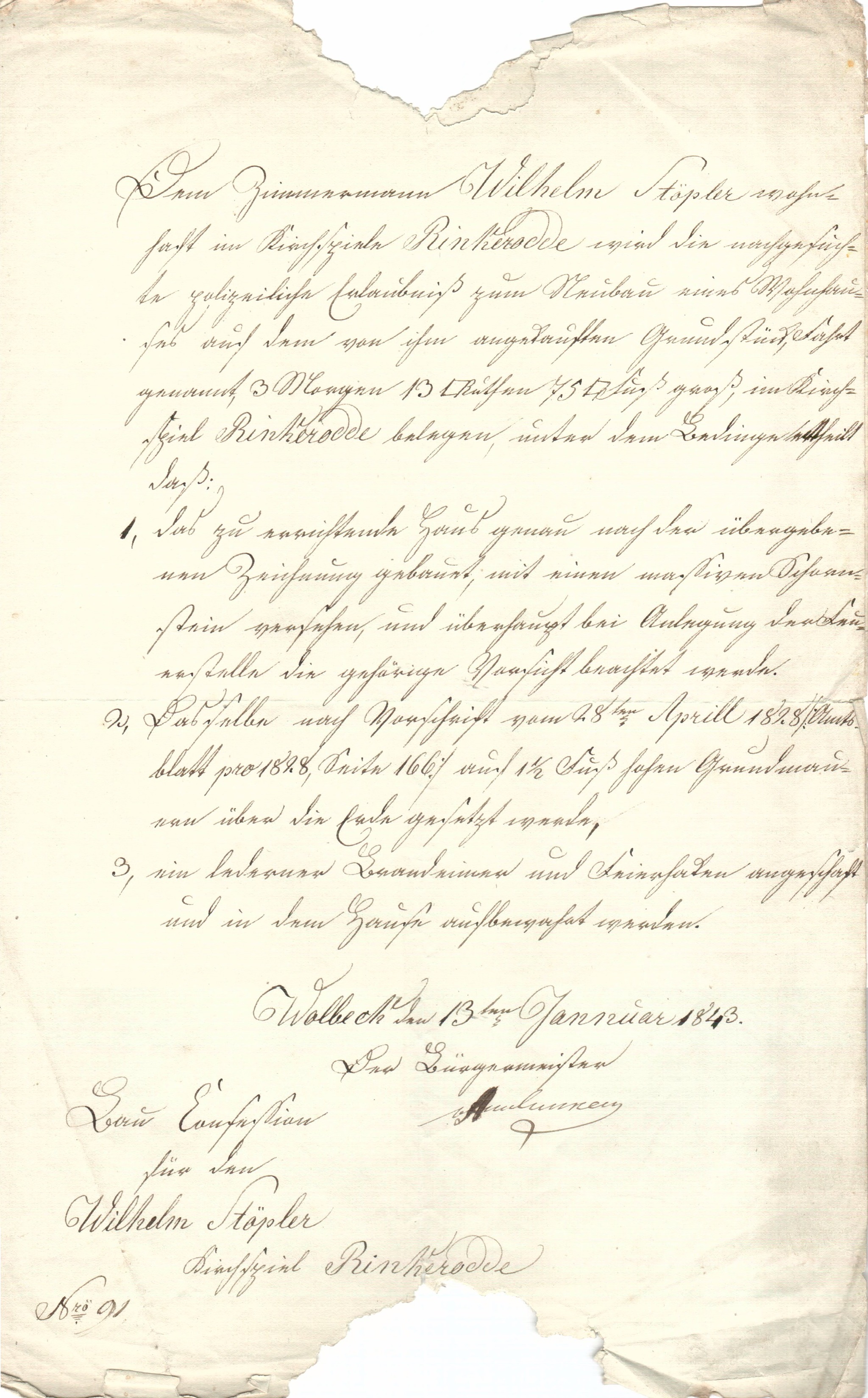 Diese 290 rthr [Reichsthaler] 10 sgr [Silbergroschen] muss Wilhelm Stöpeler binnen 6 Monaten bezahlen. Sein älterer Bruder Johann Stöpeler (*1795) hat sich für ihn verbürgt. Er war Zimmermeister in der Bauerschaft Delstrup, wie aus dem Kirchenbucheintrag seines Todes 1858 hervorgeht.